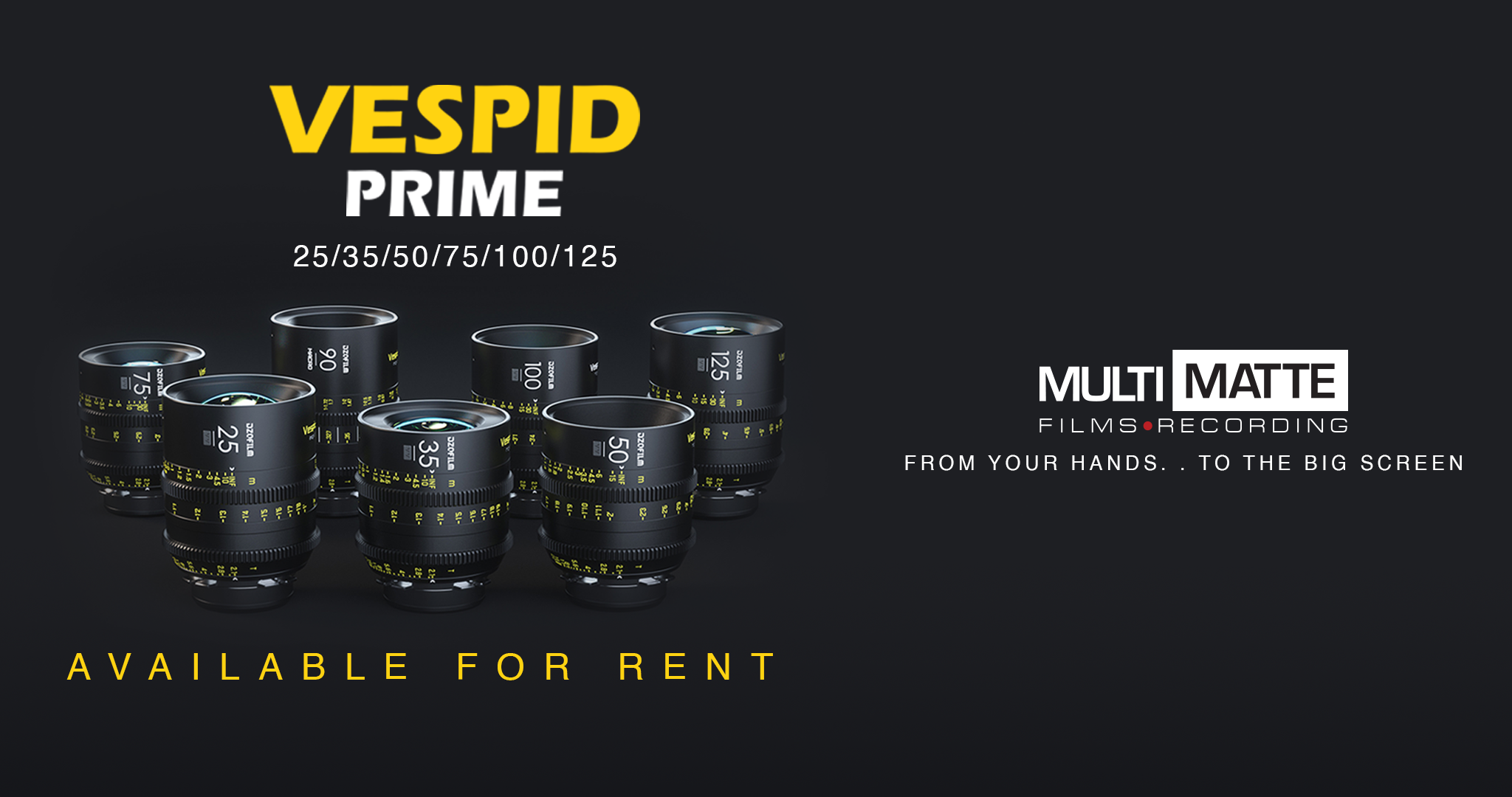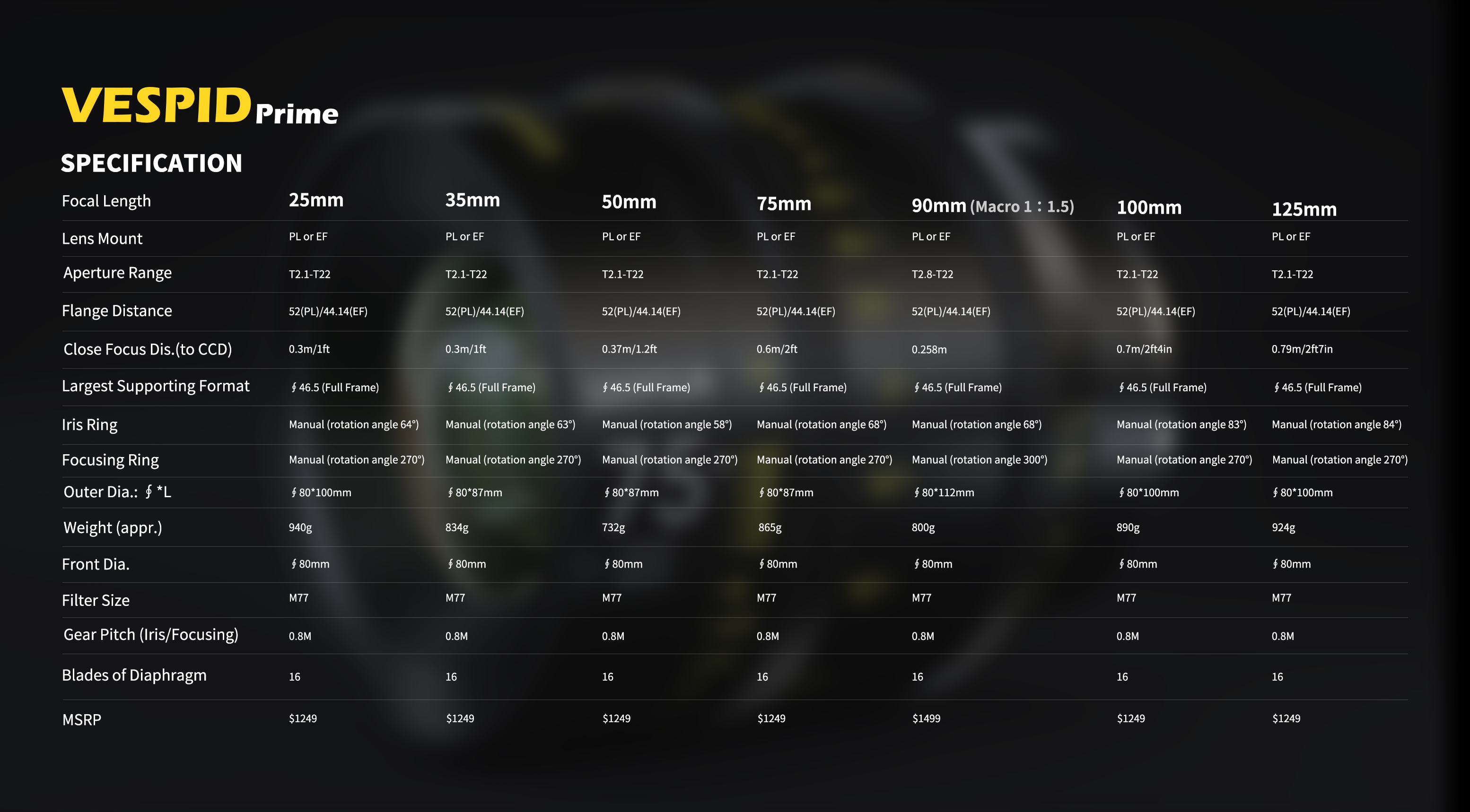 Vespid Prime is a cinematic capturing beyond full frame (46.5mm) lenses weight only 732g-940g.Vespid Prime is very compact and potable convenient for your next projects.